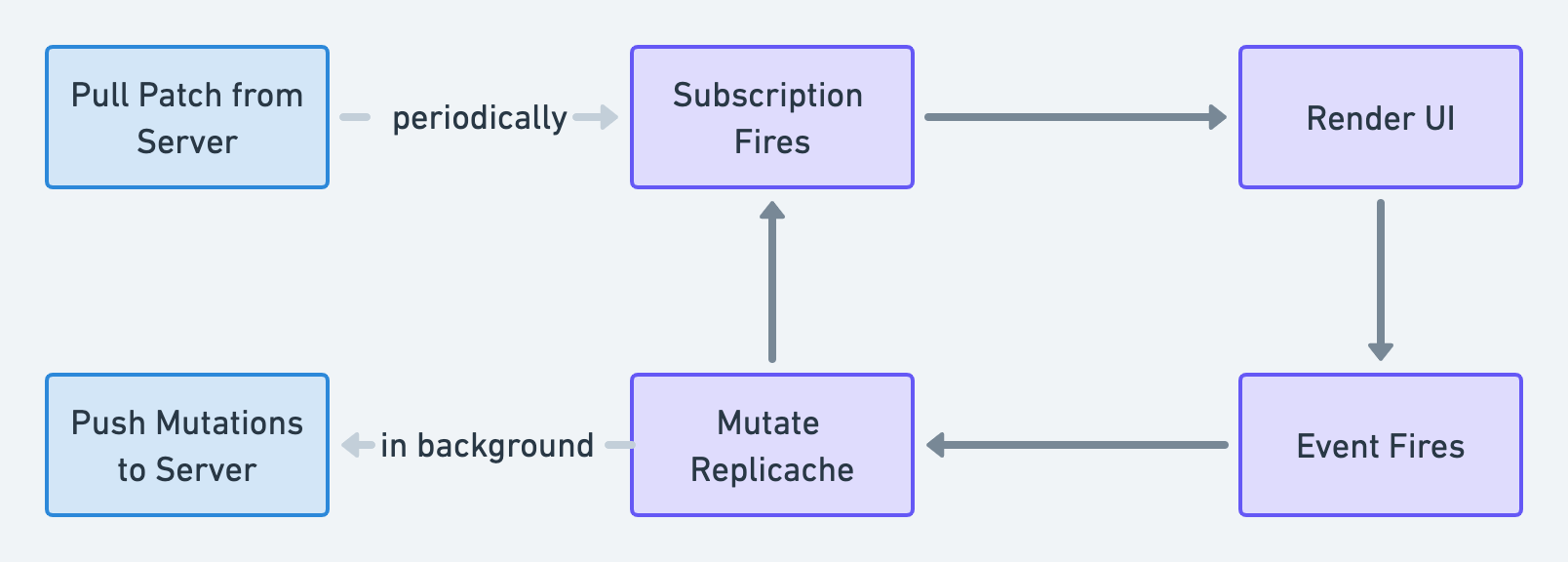 Replicache enables instantaneous UI and realtime updates by taking the server round-trip off the application’s critical path, and instead syncing data continuously in the background.